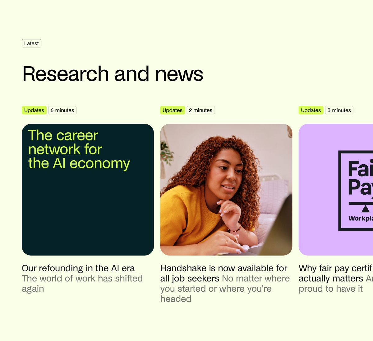 With this new vision, the brand design team updated the design and messaging of Handshake’s homepage to better reflect the future of work and our new mission.